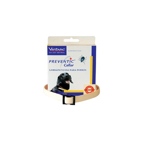 Collar antiparasitario: Para su uso en perros de tres meses en adelante; para el control y tratamiento de garrapatas durante 3 meses y auxiliar en el control de la sarna demodéxica canina durante 28 días. Elimina el 100% de las garrapatas en 24 a 72 horas. Previene la fijación y el efecto de regurgitación sobre Rhipicephalus sanguineus, por lo que contribuye en la prevención de Ehrlichia canis. Preventic es un collar antiparasitario autorizado para su uso en perros. Incorpora en su matriz un insecticida del grupo de las amidinas llamado Amitraz, el cual pertenece al grupo de las formamidinas. Ejerce su efecto por inhibición de la enzima monoamino oxidasa, la cual es responsable del metabolismo de las aminas neurotransmisoras presentes en el sistema nervioso de ácaros y garrapatas sensibles