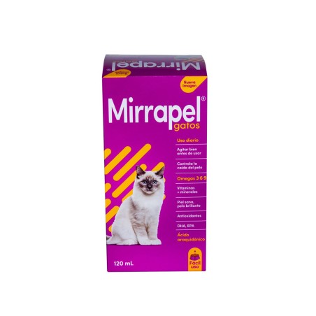 Mirrapel Gatos es un suplemento nutricional de suministro oral y diario formulado para gatos de todas las razas. Su consumo es apto para gatos en todas las etapas de la vida, ya sea gatitos, adultos, etapa senior y etapa de gestación. Su fórmula está enriquecida con nutrientes e ingredientes de calidad como vitaminas, minerales, ácidos grasos, antioxidantes, entre otros. Que contribuirán a una vida sana y llena de vitalidad.