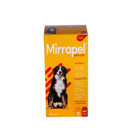 Mirrapel Senior es un suplemento nutricional para perros o gatos adultos en etapa senior que está formulado para cuidar su salud y mantener su vitalidad por más tiempo. Mirrapel senior contiene ingredientes de alto valor nutricional que contribuirán a la salud en general de perros y gatos en etapa de vejez como vitaminas, minerales, glucosamina, condroitina, ácidos grasos, protectores de hígado, entre otros. Este suplemento nutricional puede ser suministrado diariamente a partir de los 6 años de edad para contribuir al incremento de la vitalidad, las defensas, la salud articular, cuidar la salud de la piel y el brillo del pelaje, revitalizar el cerebro, entre otros beneficios. Mediante el consumo diario de Mirrapel tu mascota Senior mantendrá un estado corporal mejor para vivir por más tiempo. Puedes encontrarlo en 2 diferentes presentaciones: 236 ml y 120 ml.