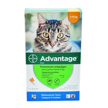 La administración de Advantage® ha sido diseñada para la prevención y tratamiento de las infestaciones por pulgas (Ctenocephalides sp.) y larvas de pulgas (Ctenocephalides felis), en Gatos con un peso inferior o igual a los 4 Kg.