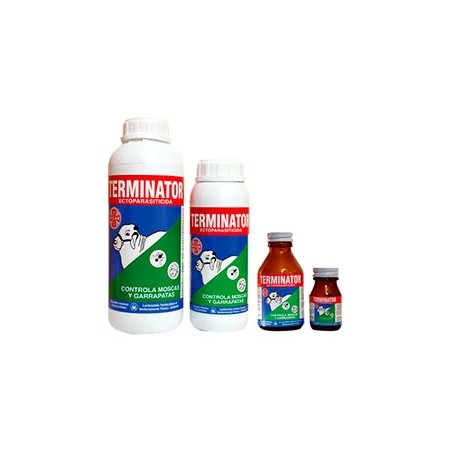 INDICACIONES: En bovinos para el control de las garrapatas boophilus microplus y amblyomma cajanense y de las moscas stomoxys calcitrans lyperosia irritans mosca domestica DOSIS: Debido al efecto residual de terminator los baños se deben practicar asi Para boophilus micrplus cada 21 dias para amblyomma cajenense cada 7 dias Para stomoxys calcitrans cada 20 dias para lyperosia irritans cada 20 dias La recarga de los baños requiere una dilución de 500ml de terminator por cada 333ml de agua bomba de espalda dilución de 1ml de producto en 1 litro de agua