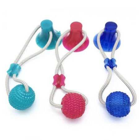 Juguete de caucho con pelota y chupa para adherir a superficies lisas y dejar que el perro juegue y queme energías tratando de despegarla o simplemente juegue mordiendo la pelota y corriendo de un lado a otro.