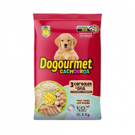 Dogourmet – Cachorros 3 Cereales, contiene omega 3 y 6 que previenen enfermedades cardio vasculares y permiten que el perro tenga una piel sana y pelo sedoso y brillante. Cuenta con aprendix DHA, un sistema nutricional que contribuye con el desarrollo cerebral del cachorro aportando a su aprendizaje y crecimiento. Dogourmet es un alimento para todas las razas con deliciosas croquetas con la textura y el tamaño ideal.