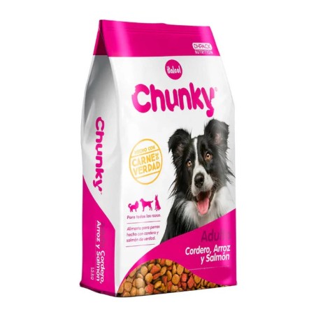 CHUNKY Cordero, Arroz y Salmón es una fórmula especial para perros adultos diseñada para reducir el riesgo de problemas cutáneos asociados con la sensibilidad alimentaria. Este alimento para perros está compuesto por ingredientes altamente tolerables como cordero y salmón, los cuales eliminan la posibilidad de irritación en la piel.